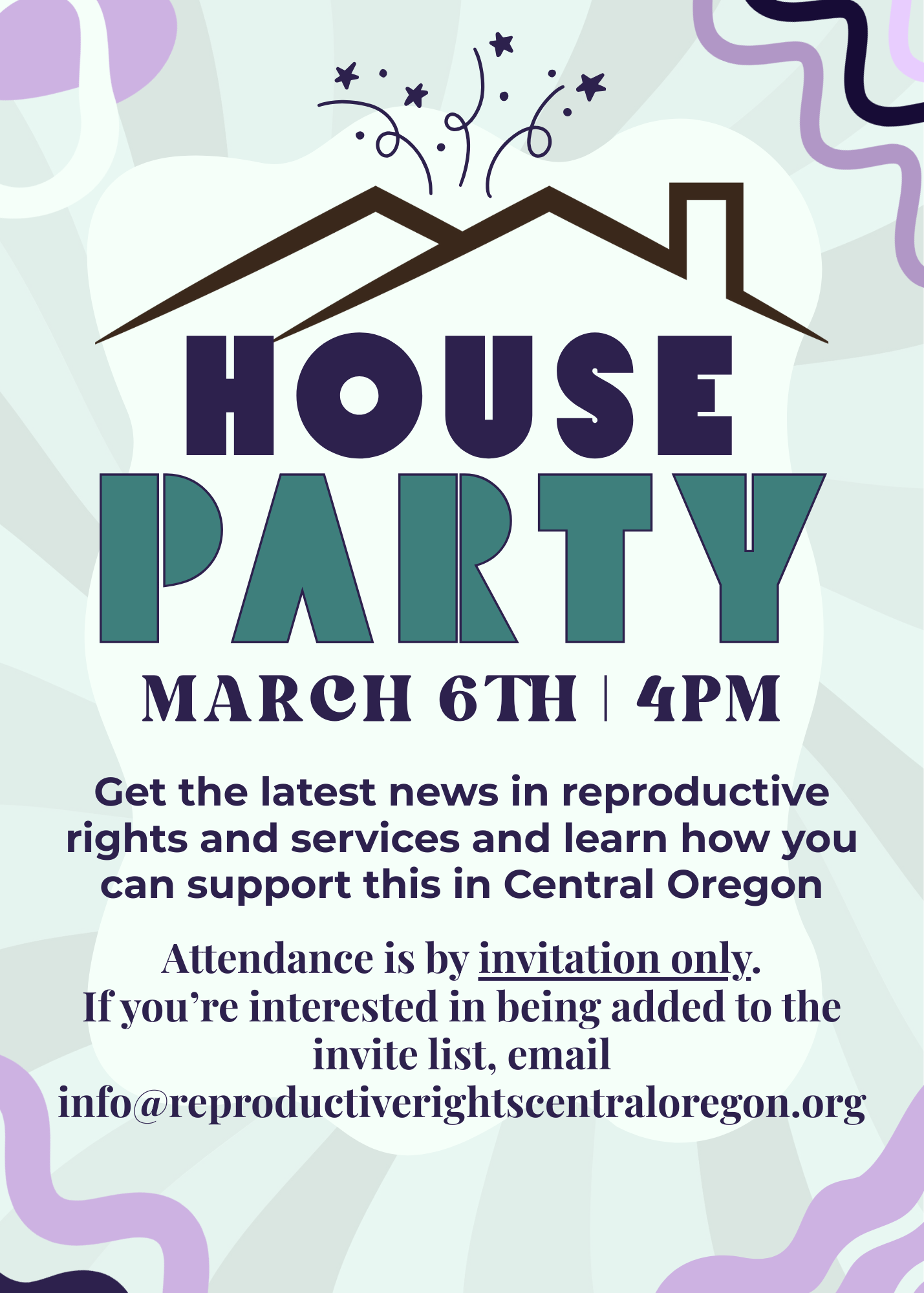 House Party Fundraiser Friday, March 6, 2026 4:00 PM 7:00 PM Bend, OR (map) Google Calendar ICS This invitation-only event is an opportunity to learn the latest news in reproductive rights and services, and how you can support those rights in Central OregonIf you’re interested in being added to the invite list please email us!